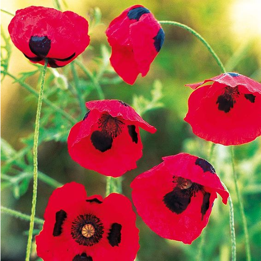 A distinctive low-growing poppy in a bright fire-engine red with a conspicuous black spot on each petal. Ideal as a rock garden or alpine plant as well as for borders. Height 40cm (16"). RHS Award of Garden Merit winner. HA - Hardy annual.