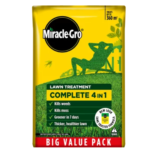 Miracle gro Complete 4 in 1 feeds your lawn whilst also working to kill weeds and control moss. The WaterSmart™ formula helps to protect against heat, drought and other stresses. Your lawn will be greener in 1 week, the moss will blacken and can then be easily raked out, and weeds will be killed within 3 to 5 weeks.