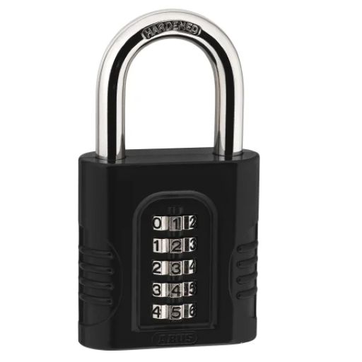 The ABUS 158 Series Combination Padlock with a solid die-cast zinc body and a hardened steel shackle. 3-digit (40mm), 4-digit (50mm), or 5-digit (65mm) resettable combination where you can set your own PIN.