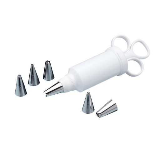 Fun and functional, this piping syringe set will have you on your way to stunning looking treats in no time. It works just like a piping bag. Simply fill it with buttercream or royal icing, attach one of the six included icing nozzles and push the plunger down to give your cakes, cupcakes and biscuits that professional final flourish. Each of the stainless steel piping nozzles screws on and off the coupler really easily, so you can switch to achieve different icing effects with minimal effort. Perfect for the keenest of cake decorators and home bakers, this icing gun is made of durable plastic.