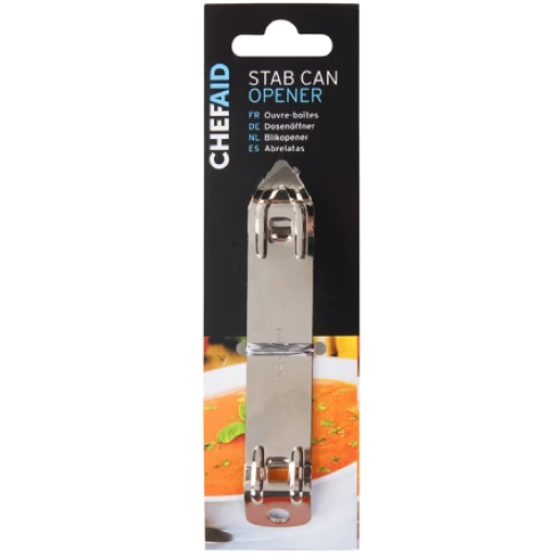 A traditional style stab can opener. It is easy to use and made from durable metal for long lasting use.