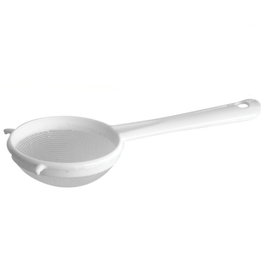 6cm Nylon Strainer. The white plastic and nylon construction is heat resistant and features two balancing hooks for easy use.