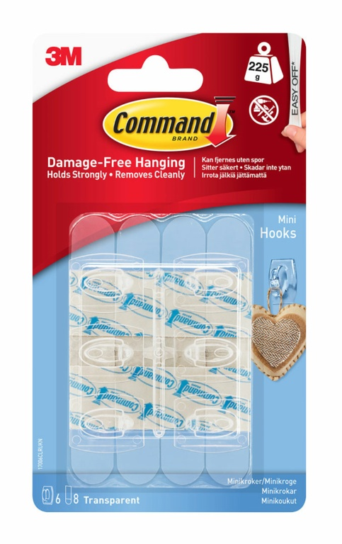Forget about nails, screws and tacks, Command™ Clear Hooks are fast and easy to hang! The revolutionary Command™ Clear Adhesive Strip adhere firmly to many surfaces, including paint, wood, tile and more. Yet, come off leaving no holes, marks, or sticky residue. Command™ Clear Hooks and Strips blend in seamlessly allowing you to show what matters most, your decor, not how it's hung up. Rehanging them is as easy as applying a Command™ Clear Refill Strip, so you can take down, move and reuse them again and again!