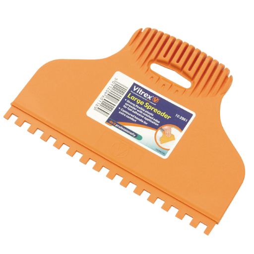 The Vitrex 10 2961 Large Spreader is a strong flexible plastic spreader with notched edge for fast adhesive application. It has a contoured handle for extra comfort.