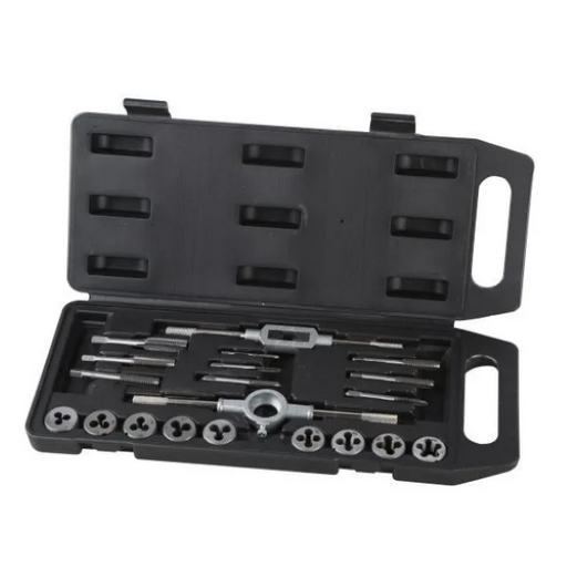 High quality alloy steel containing popular metric tap, dies and holders. Contains: 1 die handle, 1 tap wrench, 1 t-type tap wrench, 1 screw pitch gauge, and 17 tap and dies.