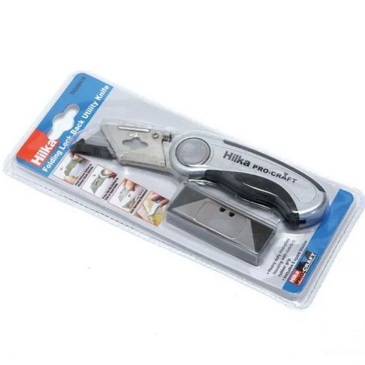 Heavy duty zinc alloy design with push button release. Quick blade change with internal blade storage. Non slip rubber grip. Includes 5 spare blades.